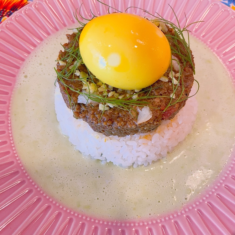 ドライカレーは3度美味しい! まずはてっぺんのドライカレーだけ食べる!その次にポタージュと食べる!そして半熟卵を崩して食べるのです。
